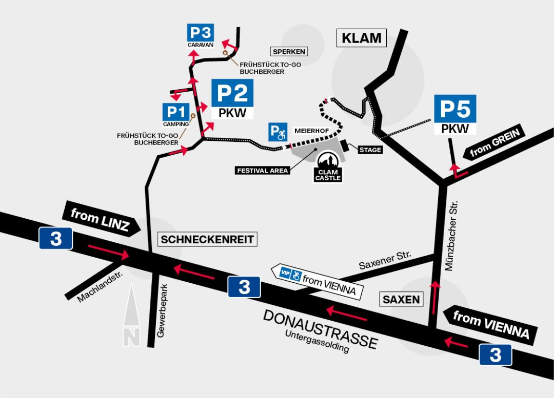 Wir empfehlen den Zug bis Amstetten oder Saxen zu nehmen und anschließend mit einem Taxi zum Konzertgelände zu fahren. Bitte beachtet die Abfahrtspläne vom Bahnhof Saxen für die Heimreise, da hier Stand November 2025 nach 21:26 keine Zugverbindungen geplant sind.