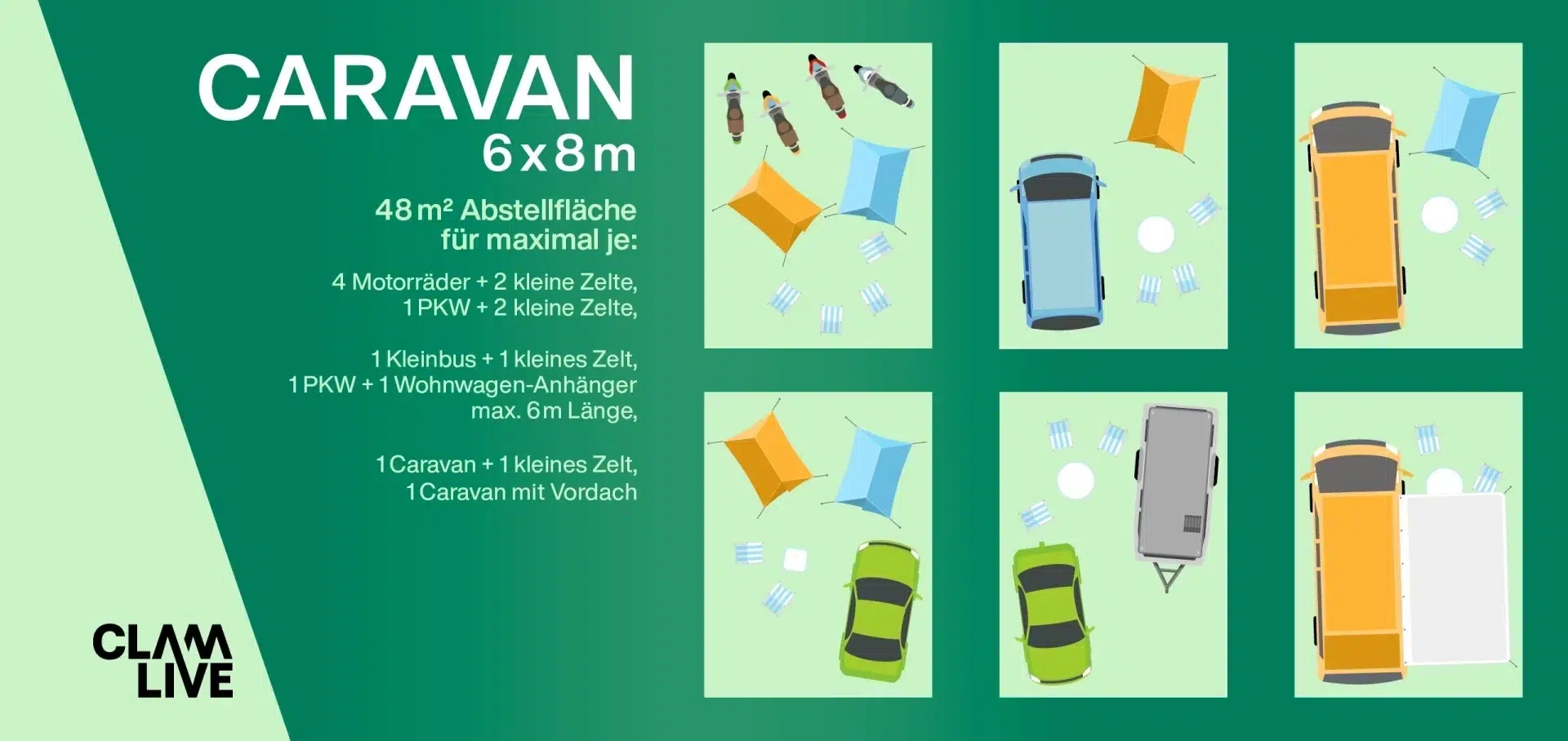 Mit dem Caravan-Ticket steht eine Fläche von 48 (6m breit und 8m tief) zur Verfügung, hier ist ein Zutrittsband für das Konzertgelände für wiederholtes verlassen und Betreten inkludiert. Ebenfalls inkludiert sind sanitäre Anlagen mit WCs, Waschmöglichkeiten und Warmwasserduschen. Es gibt keinen Stromanschluss am Caravanplatz.
