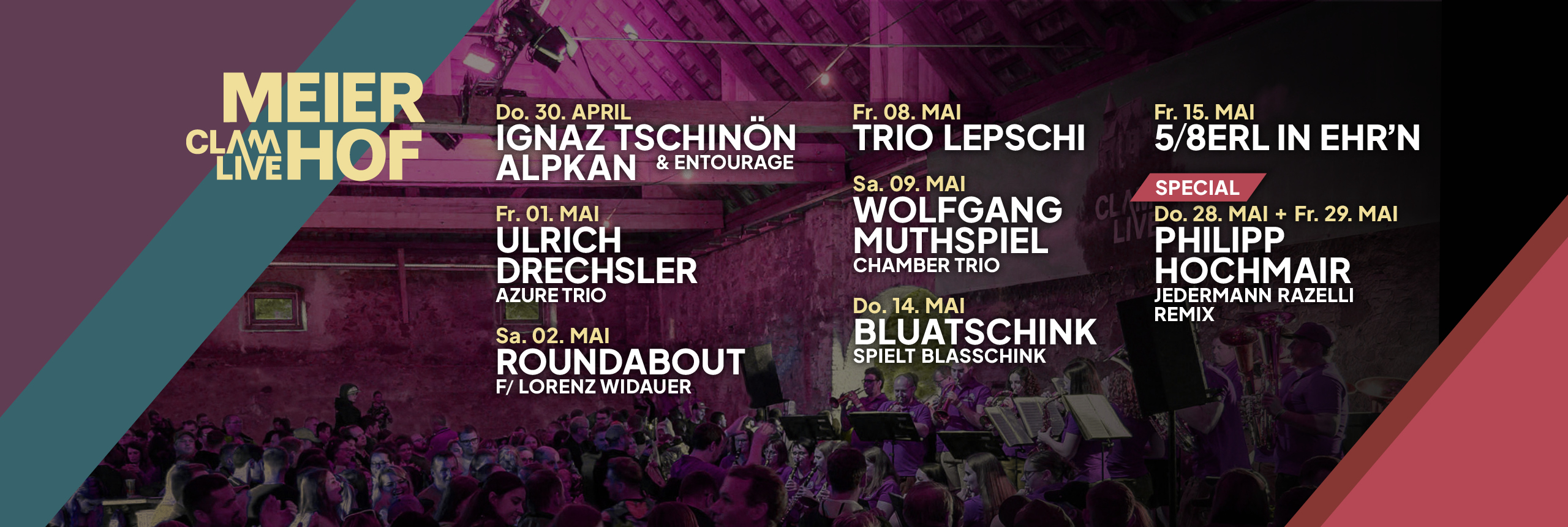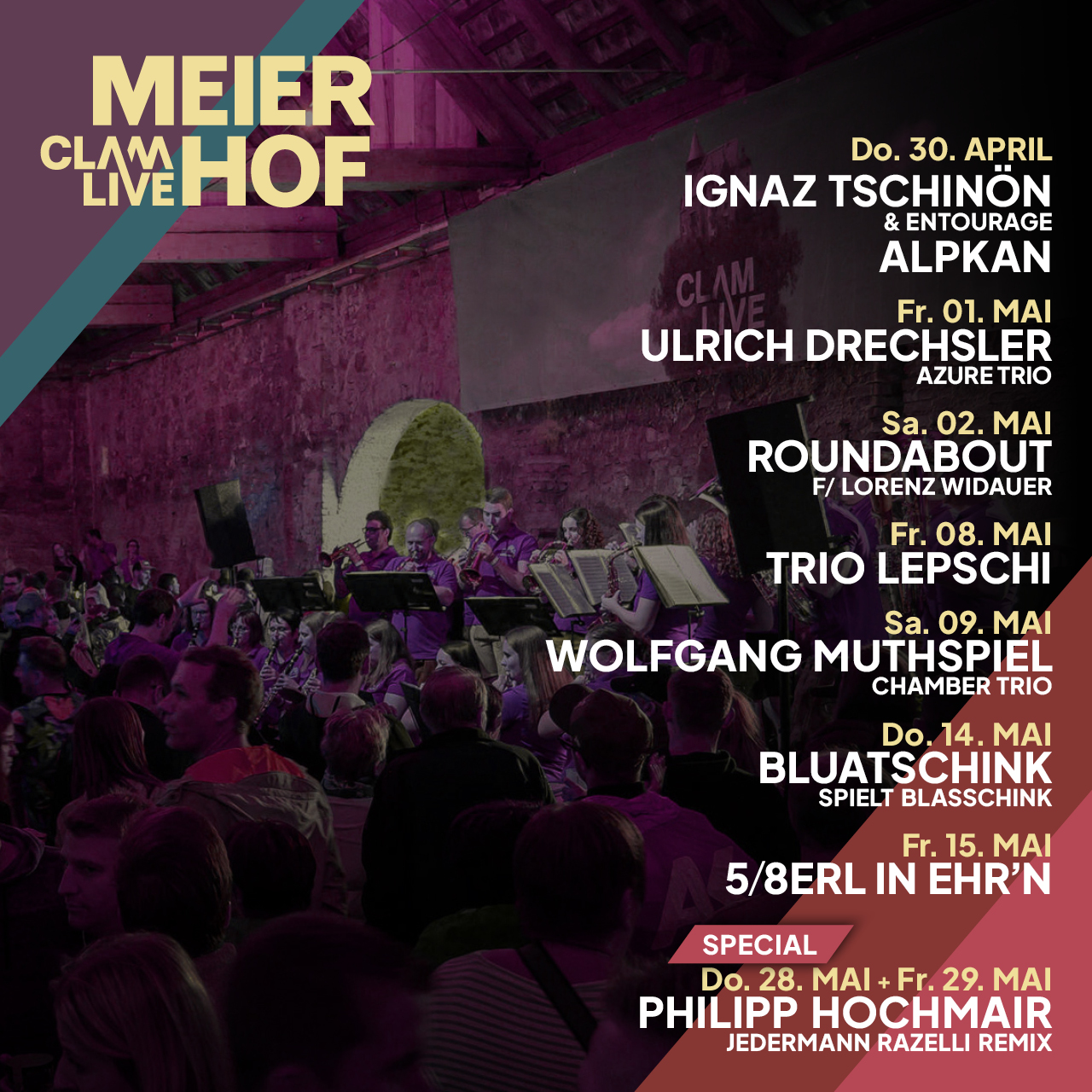 Der Meierhof in Klam öffnet seine Pforten für eine besondere Bühne: Als kleine, feine Schwester der großen ClamLive-Konzerte präsentiert der adaptierte Stadl ein vielfältiges Programm auf höchstem künstlerischem Niveau. Von Jazz und Funk über Wienerlied bis hin zu musikalischen Interpretationen großer Theaterstoffe reicht das stilistische Spektrum.